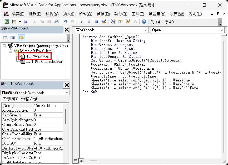 10. 在『powerquery.xlsm』檔案中,建立一個新『file_selection』工作表(worksheet)。按『ALT + F11』打開VBA編輯器,選擇『ThisWorkbook』位置,加入以下程式。這程式主要是是在每次打開『powerquery.xlsm』檔案時,取得Windows登入用戶名稱、網域名稱及Excel用戶名稱,並儲存在『file_selection』工作表。而今次最主要用到的,就是Windows登入用戶名稱。