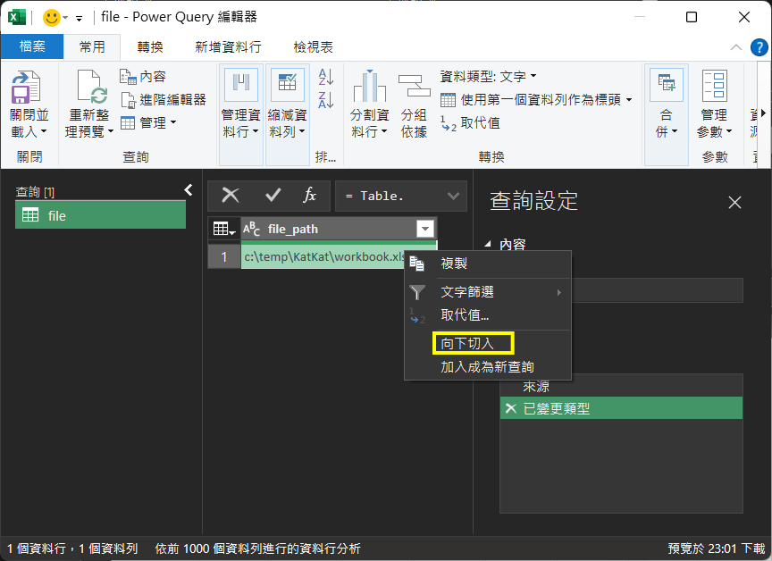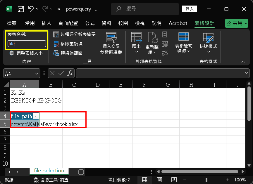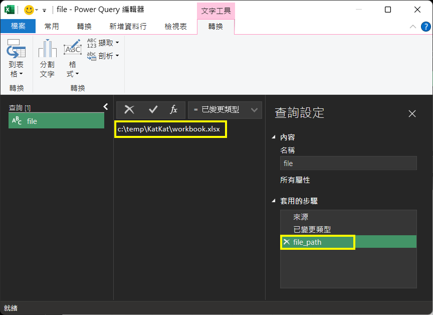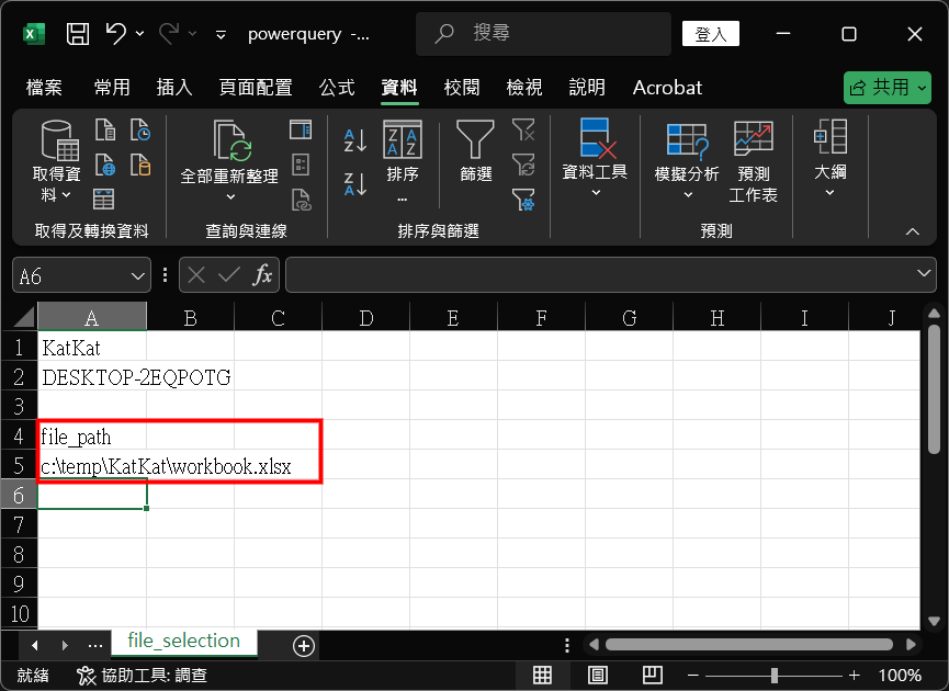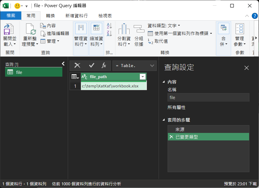 29. 完成後,會看到『Sheet1』查詢已跟file_path』數值(即『C:\temp\KatKat\workbook.xlsx』)作出變動。