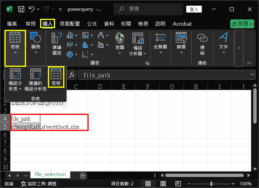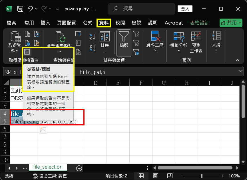 11. 而在『file_selection』工作表另一儲存格(cells),建立動態內容及其標題(file_path),以對應根據用戶名稱變動的資料夾名稱。