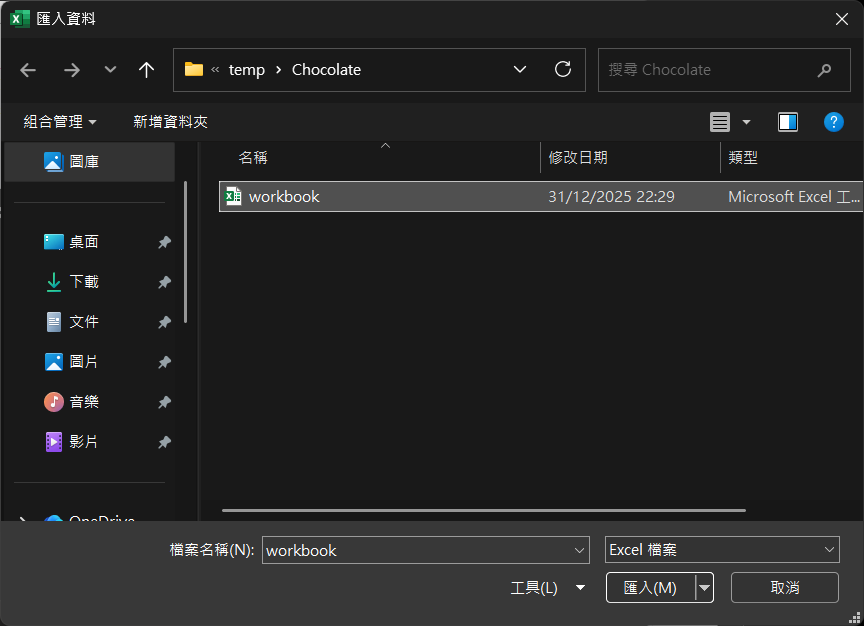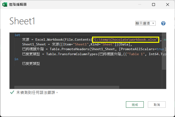來源 = Excel.Workbook(File.Contents("C:\temp\Chocolate\workbook.xlsx"), null, true),