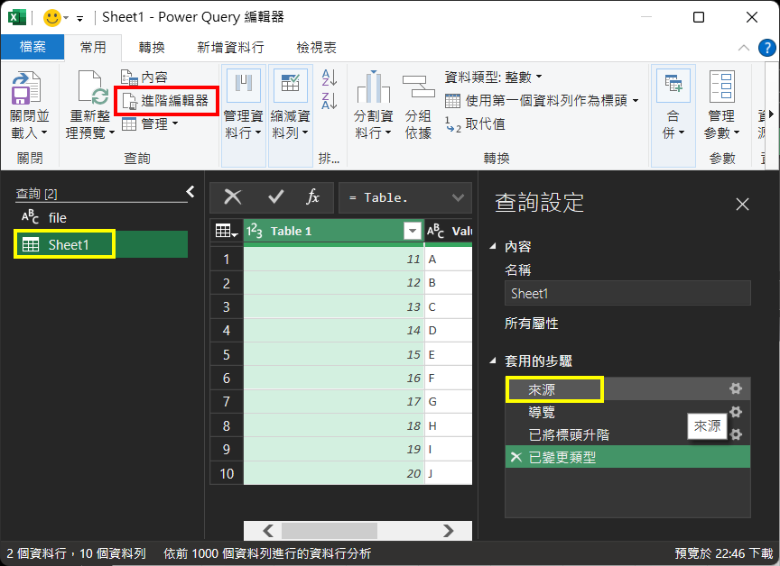 24. 再次打開『Power Query編輯器』。選擇『Sheet1』查詢。在右邊選擇『來源(Sources)』,按上面『進階編輯器』按鈕。