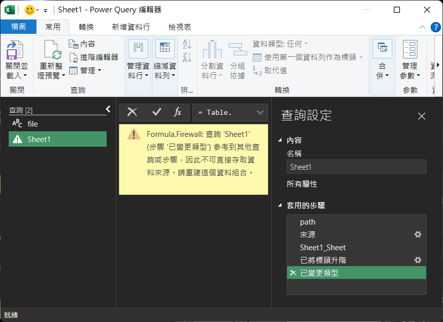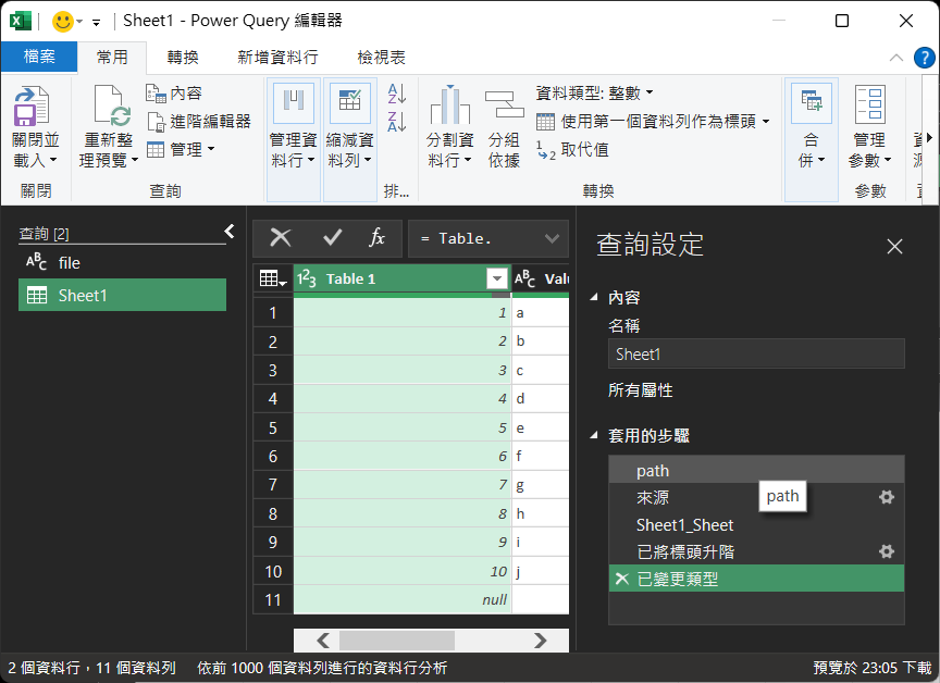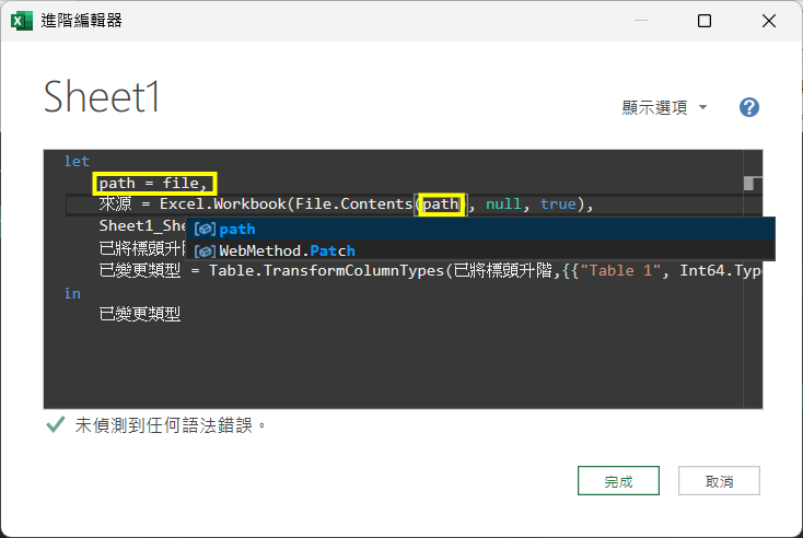 來源 = Excel.Workbook(File.Contents(path), null, true),