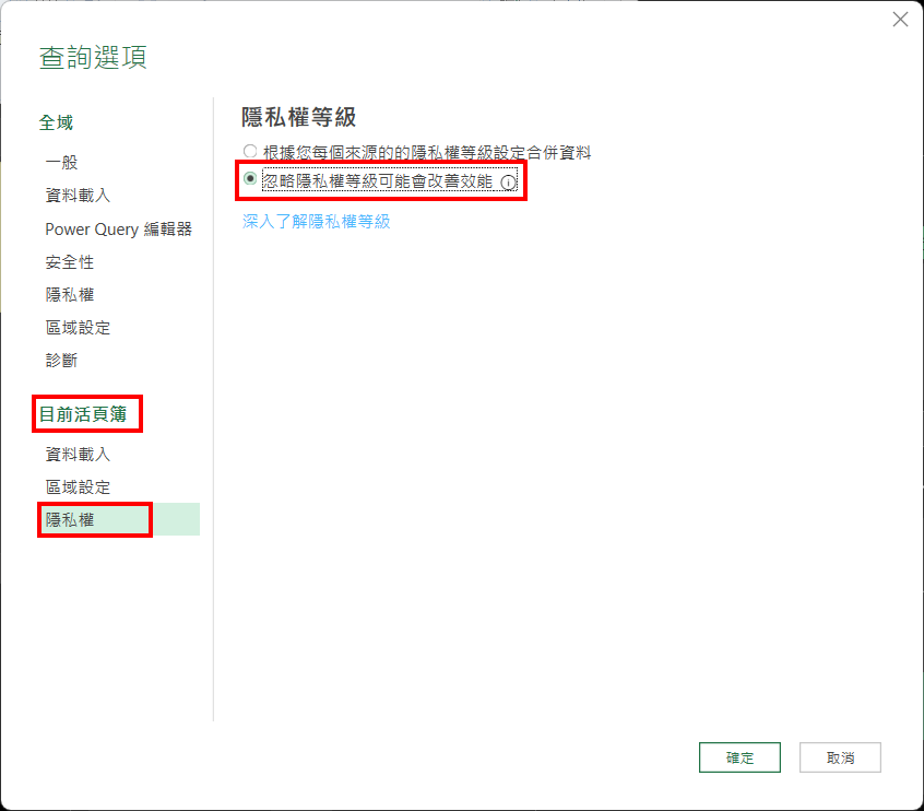 28. 在左邊『目前活頁簿(Current File section)』位置,『隱私權(Privacy)』,將『隱私權等級(Privacy level)』,更改為『忽略隱私權等級可能會改善效能(Ignore the privacy levels and potentially improve performance)』。