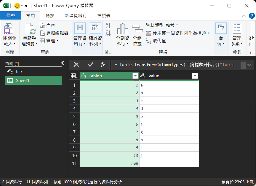 22. 完成後,便會看到『Chocolate』活頁簿中,『Sheet1』工作表已加入。按左上角『關閉並載入』按鈕,退出『Power Query編輯器』。