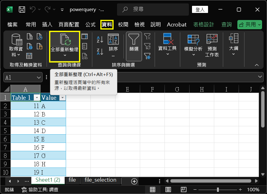29. 再選上面選單『資料(Data)』,按『全部重新整理(Refresh all)』,Excel Sheet1便會按照不同用戶名稱,存取其本機上資料,對『powerquery.xlsm』檔案內容作出更新。